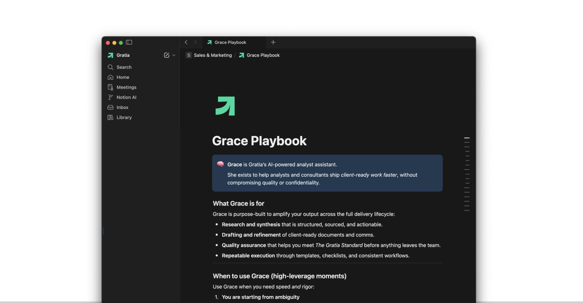 Since joining Gratia, I've shipped client-facing deliverables for a Fortune 500 PE firm and a global tech company. Week to week, I build KPI reporting and performance deep dives in Excel and Google Sheets, write decision memos in Notion that leaders actually act on, and improve models and dashboards through structured feedback cycles. The work is real, the expectations are clear, and I have more control over how I spend my time than I ever did in traditional consulting.